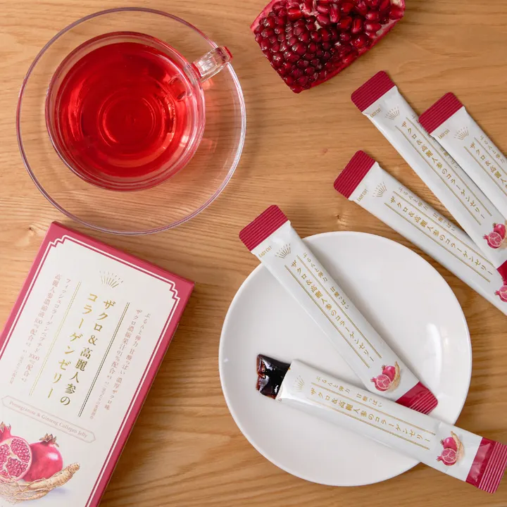 甘酸っぱく芳醇なザクロ濃縮果汁を91%配合し、さらにフィッシュコラーゲンペプチド1000mg・高麗人参濃縮液100mgもプラスした贅沢なゼリーです。 携帯しやすいスティックタイプで、コリっとした満足感たっぷりの食感を外出先でも気軽に楽しめます。 もうひと頑張りしたい時のリフレッシュや、もっと輝きたい日の前などにおすすめです。