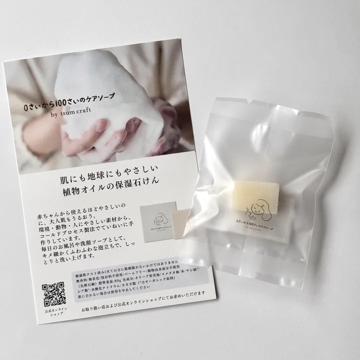 シンプルケアでうるおい叶う、看護師が考えた保湿石鹸 0さいから100さいのケアソープ サンプル1個5g 洗顔で2〜3回分、全身で1〜2回分 お客様へのプレゼントや試供品として ■お子さんの肌に安心なものを選びたい親御さん ■何を使っても肌に合わない敏感肌さん ■時間がない。体調がすぐれない。ゆっくりスキンケアが難しい方 ■環境にやさしい製品を選びたい方 そんな方に届けたくて、作りました。 赤ちゃんから使えるほどやさしいのに、大人の肌もうるおう石鹸 クリームや美容液をたくさん塗る必要はありません。 植物オイル由来の保湿成分が豊富! 洗いながらもしっとり感じるのが特長です。泡切れがよいため、すすぎも簡単。 よく泡立て、手でやさしく洗ってください。もちろん、顔にもお使いいただけます。 子どもと一緒に使えるから、楽しく時短できるのも嬉しいポイント。 ■天然由来100%・無添加* ■国産やオーガニックの植物オイル ■コールドプロセス製法で30日間熟成 ■一つひとつ手作り ■敏感肌テスト済み** *無香料・無着色・保存料不使用 **全ての方に肌刺激がないわけではありません 天然由来成分100% 余計なものは一切入れないことにこだわりました。 この石鹸は「植物オイル」「水」「水酸化ナトリウム」の3つの素材から作られています。 しっとり感と洗浄力、泡立ちの良さを両立させるため、植物オイルは5種類を独自の配合でブレンド