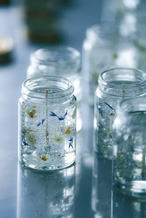 小さなガラス瓶の中に、花が風に揺れているような情景を閉じ込めたキャンドルです。 透明なジェルワックスの中で、小さなハーブの花が軽やかに浮かびます。 ぷくぷくと閉じ込められた気泡が光を受けてきらめき、点灯前から涼やかな存在感があります。 灯すと内部の光が溶けるように広がり、瓶の中で花がより立体的に浮かび上がります。 小瓶タイプのため安定感があり、普段あまり蝋燭を使わない方にも扱いやすい設計です。 花の入り方や気泡の表情は一つ一つ異なります。 手仕事ならではの個体差としてご理解ください。 高い透明度を持つジェルワックスを使用し、花材との距離や配置を調整して制作。 視覚的な軽やかさとギフト需要を兼ね備えた、小型展開向けキャンドルです。