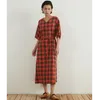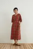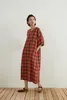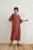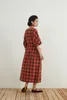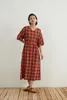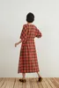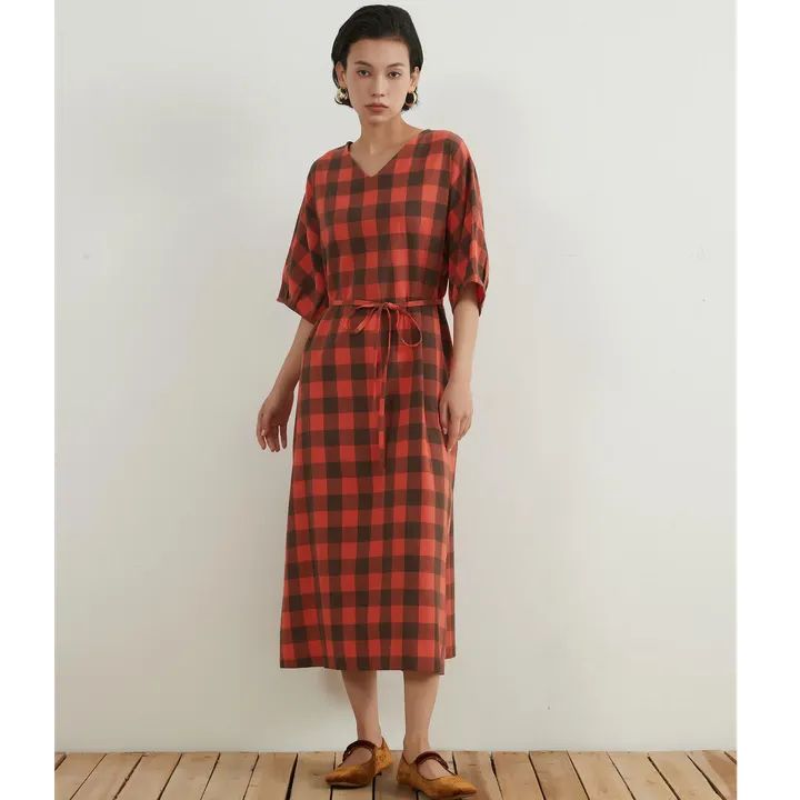 KNNO329コットン100%Vネックチェックワンピースベルト付き REDBROWN/FREE