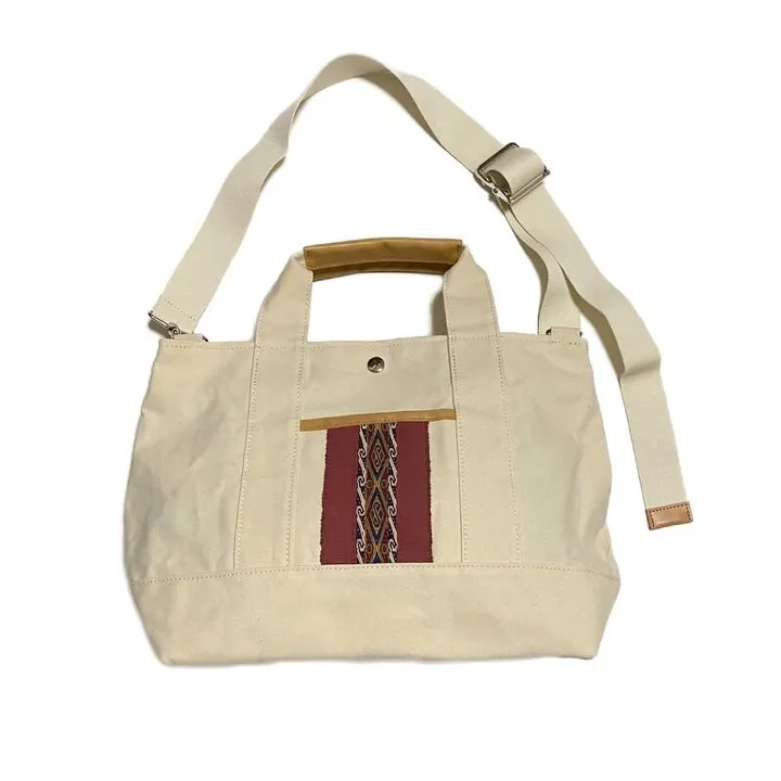 ポケットにあしらったウールの織物は、先住民の女性たちが、クスコ伝統技法により、植物染料により羊毛を染め、自らのアイデンティティである模様を手織りをした適すタオルです。このテキスタイルを活かすために選んだキャンバス地は、やや細めの糸で織ったきめが細かく、柔らかなエクリュー色。ハンドル部分に革を縫い付けてあるにもかかわらず、重さはなんと550gと軽く、持ちやすい仕様です。 1.たくさん入るのにコンパクト! バッグの口を少しだけ狭くすることによって、たくさんのモノをしっかりモノを収納できるのに、コンパクトに見えます。そして、よりスタイリッシュに見せることができます。 2.汚れにくく、型崩れしにくいわけは・・・ このバッグはパラフィン加工が施された10号帆布を使用しています。糸の密度が高く、しっかりと織りあげてありますので、軽くパリッと張りがあります。さらにパラフィン加工(ワックス加工)が施されているため、型崩れしにくく、汚れにくいです。また、お手入れしやすいのもいいですね。底板を入れてありますので、より型崩れしにくくなっています。 3.機能的でシンプルなデザイン いろんなファッションに合わせていただけるようにシンプルなデザインにしました。アクセントのPeru Landから届いた手織物は外ポケットにあしらいました。シンプルなデザインがこの手織物をより引き立ててくれています。シンプルだけでなくカッコいいトートです。 ポケットは全部で3つ、クスコの織物をセンターに配置した外ポケットと、たっぷりの大きさがある内ポケットが2つ。バッグのクローシャーはスナップボタン、手提げの部分と外ポケットの上部には、本革(牛)を使用しています。バッグの上部両サイドには、Dカンを付けてあります。付属のショルダーストラップを付けていただけます。