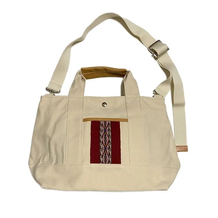 ポケットにあしらったウールの織物は、先住民の女性たちが、クスコ伝統技法により、植物染料により羊毛を染め、自らのアイデンティティである模様を手織りをした適すタオルです。このテキスタイルを活かすために選んだキャンバス地は、やや細めの糸で織ったきめが細かく、柔らかなエクリュー色。ハンドル部分に革を縫い付けてあるにもかかわらず、重さはなんと550gと軽く、持ちやすい仕様です。 1.たくさん入るのにコンパクト! バッグの口を少しだけ狭くすることによって、たくさんのモノをしっかりモノを収納できるのに、コンパクトに見えます。そして、よりスタイリッシュに見せることができます。 2.汚れにくく、型崩れしにくいわけは・・・ このバッグはパラフィン加工が施された10号帆布を使用しています。糸の密度が高く、しっかりと織りあげてありますので、軽くパリッと張りがあります。さらにパラフィン加工(ワックス加工)が施されているため、型崩れしにくく、汚れにくいです。また、お手入れしやすいのもいいですね。底板を入れてありますので、より型崩れしにくくなっています。 3.機能的でシンプルなデザイン いろんなファッションに合わせていただけるようにシンプルなデザインにしました。アクセントのPeru Landから届いた手織物は外ポケットにあしらいました。シンプルなデザインがこの手織物をより引き立ててくれています。シンプルだけでなくカッコいいトートです。 ポケットは全部で3つ、クスコの織物をセンターに配置した外ポケットと、たっぷりの大きさがある内ポケットが2つ。バッグのクローシャーはスナップボタン、手提げの部分と外ポケットの上部には、本革(牛)を使用しています。バッグの上部両サイドには、Dカンを付けてあります。付属のショルダーストラップを付けていただけます。