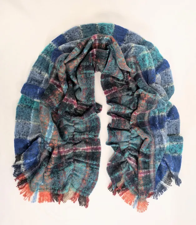 フランスの織物をパッチワークして作られた、ストールにもなるケープ風羽織です。 シャーリング加工により立体感があり、ボタンが2つついていて自由にスタイリングできます。 モヘヤを使用した三者混の生地は軽量ながら空気を含んで暖かいです。