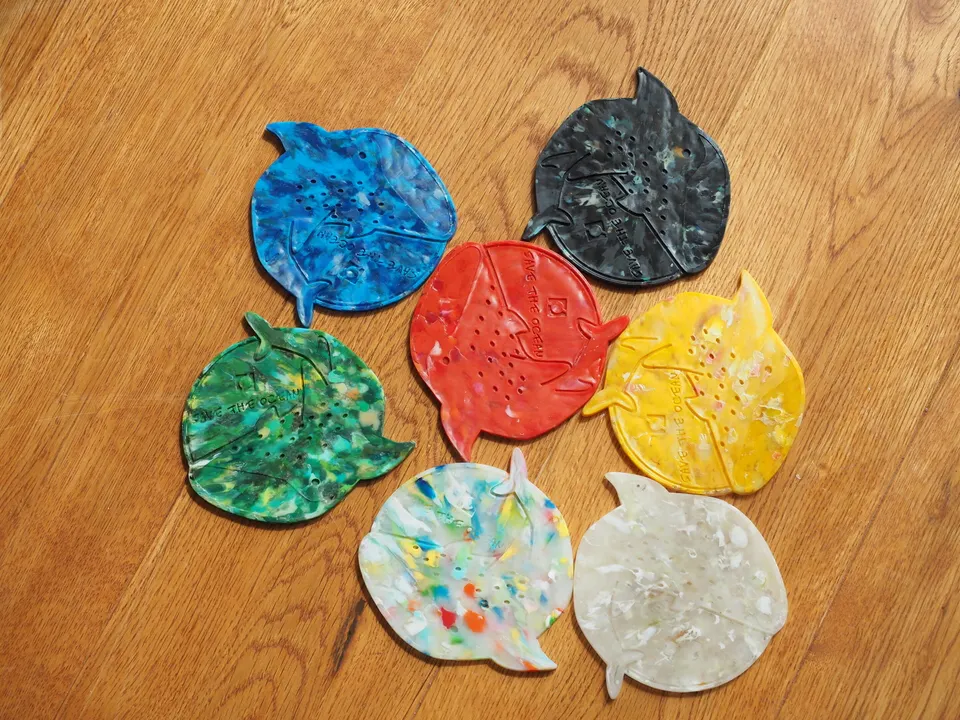 【海洋プラスチックごみ、ほぼ100%で作られたプロダクト】 独自の成形方法により、ゴミが持っていた色をそのままに一つずつ異なる色・模様を持っています。