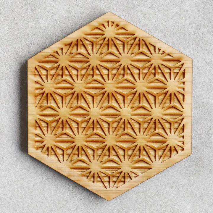 紀州材ヒノキの和柄コースター2枚入 麻の葉 六角 くりぬきなし