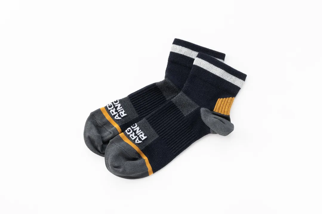 自転車専用ソックス「RING-KO(輪行)ソックス」。RING-KOソックスは、これまでの自転車ソックスにはなかった快適性と機能性を追求して開発されたモデルで、サイクリングはもちろん、輪行旅にも最適な設計となっています。 RING-KOソックスが優れている点は、まず吸汗・速乾性の高さにあります。汗をすばやく吸収し素早く乾かすため、長時間のライドでも快適さが持続します。また、フィット感にもこだわり、ペダリング時のパワーロスを抑える構造を採用。デザインは街中でのカジュアルライドにも合わせやすいショート丈とシンプルな仕上がりで、場面を問わず使いやすい一足です。 さらに、RING-KOソックスは文字通り「輪行」に最適な機能を備えています。手洗いしても一晩で乾くため、数日間の旅行でも一足で対応可能で、荷物の軽量化にも貢献します。消臭効果にも優れており、移動中や食事の際に足の臭いを気にする必要がありません。また、自転車を畳んで持ち運ぶときに合わせやすいショート丈を採用しているため、膝下ショーツなどとも好相性です。 素材にはメリノウールを使用しています。特に本製品では特許取得のハイブリッド素材「NIKKE AXIO(ニッケ アクシオ)」を採用。細くしなやかなメリノウールに、強度の高いフィラメント糸を組み合わせることで、耐久性・快適性・機能性を高いレベルで兼ね備えています。摩耗に強く毛玉ができにくいほか、汗をよく吸い乾きやすい特性を持ち、消臭効果や保温・調湿機能にも優れています。冬は暖かく、夏は放湿作用により涼しい履き心地を感じられる、年間通して頼れる素材です。 RING-KOソックスは軽量で、薄手ながら必要なサポート性をしっかり備えています。日本国内で製造されており、品質面においても安心してお使いいただけます。