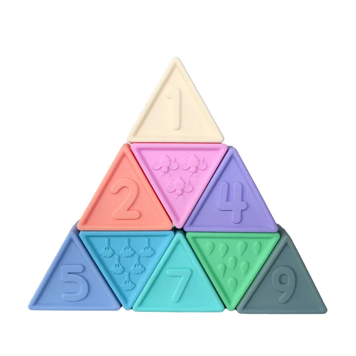 積んだり組み合わせたり、砂をすくったり、色や数字で並べてみたり。 お子さま自身が何通りもの遊び方を工夫でき、創造力や思考力を養うのに役立ちます。 ■五感を使ったセンサリープレイで心身の発育応援 jellystone designsは、オーストラリアから上陸したベビー〜トドラー向けトイブランド。 創造力や思考力、集中力といった「非認知能力」をはぐくむ方法として、現在注目を集めている「センサリープレイ(視覚や触覚、聴覚など五感に訴えかける遊び)」を応援します。 工夫次第でさまざまな遊び方ができるのが魅力。 ■創造性を養う「オープンエンド」な遊びを応援 現在、海外の幼児教育で注目されている「オープンエンドプレイ(open-ended play)」とは、ひとつの遊び方に縛られることなく、お子さま自身が自由に工夫できる遊びのこと。 このシリコンつみきも、ただ積んだり並べたりするだけでなく、水や砂をすくったり、色合わせや数字並べをしたり、お子さまのアイデア次第でさまざまな遊び方が可能です。 ■0歳から6歳頃まで、成長によりそうかたち 0歳から6歳頃まで長く使えるのもトリブロックスの魅力。 当たっても痛くないやわらかなシリコン製で、遊びながら手首や指先のトレーニングにつながる最適な重さ・サイズになっています。 また水に強く丸洗いが可能だから、お風呂場や砂場に持ち込んでも安心。 少し大きくなったら、正三角形を生かして図形感覚を鍛えたり、数字を覚えたりと、お子さまの学びを応援してくれます。 ■コットンの巾着袋付きで、お片付けやお出かけにも便利 ロゴ入り巾着袋が付属して、遊んだ後のお片付けもお子さま自身で楽しくできます。 お出かけ先に携帯するのも便利。 ■食品衛生基準の安全性と食洗機OKの便利さ jellystone designsは、熱や油分によってプラスチックから溶け出し、人体に影響を及ぼす可能性のあるBPA(ビスフェノールA)のほかフタル酸エステル・PVC不使用。 日本食品衛生基準をクリアした安全性がポイントです。 また食洗機OKでいつでも清潔に使えます。