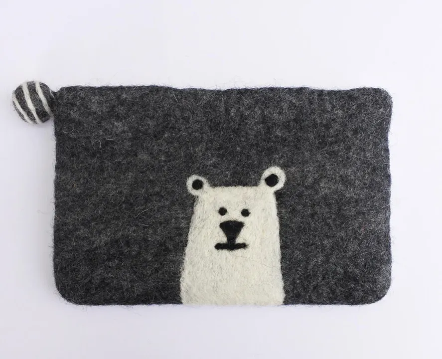 すべて手作業で作られた、どうぶつの柄のかわいいポーチ。 オリジナルデザインのどうぶつ柄、フェルトの質感と合わさって、なんともほっこりとしたかわいらしさ! フェルトのポーチはクッション性があるので、携帯を入れたり、ペンケースにするのにピッタリです。 どうぶつの模様は針で何度もさして、フェルト地にからませていくニードルポイントで施します。 フェルトは縫い目がないのが特徴です。羊毛に石鹸水のようなアルカリ性の水溶液を含ませて圧力をかけ、もんだり巻いて転がしたりして縮絨(しゅくじゅう)させ成形します。縮絨にはたいへんな手間隙がかかります。 中面にはコットンの裏地が付いています。手作りのほっこりしたあたたかさを感じてください♪