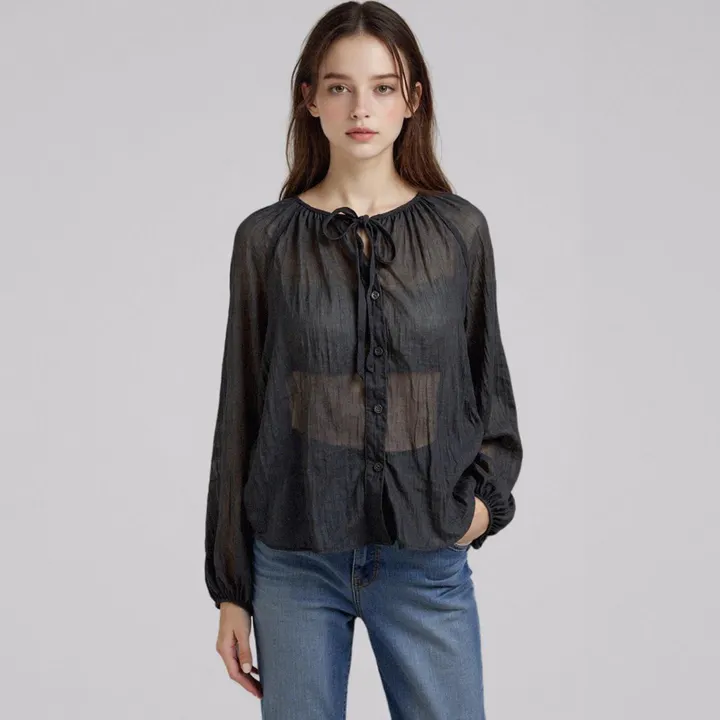25年秋の新商品で、最近秋が短くなるトレンドを反映した商品で、シースルー形態のトレンドさを強調したブラウス