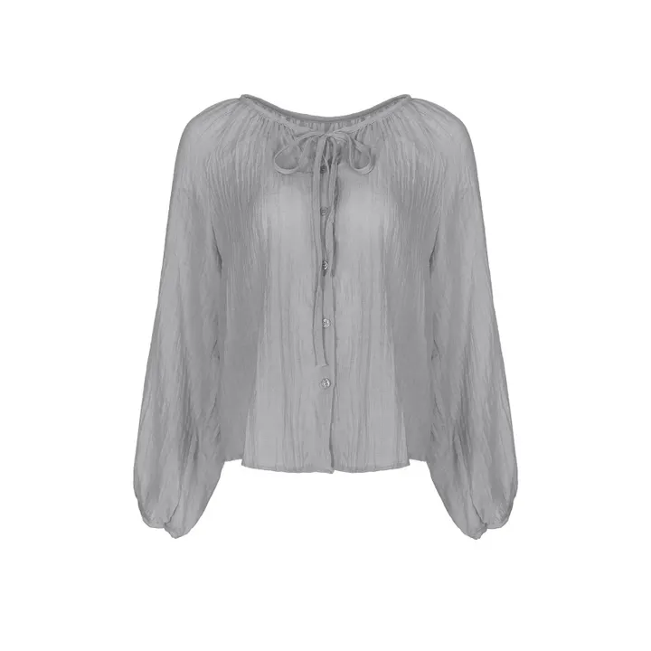25年秋の新商品で、最近秋が短くなるトレンドを反映した商品で、シースルー形態のトレンドさを強調したブラウス