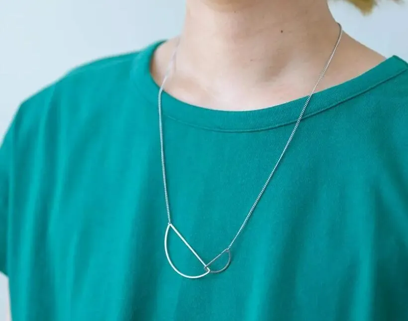 精密金属レーザーカットの技術で作られたオールサージカルステンレスのアクセサリー。 モチーフは2つのパーツで構成されていて、小さいモチーフに開けられたスリットに、大きいモチーフを通すことでネックレスがジョイントされます。手を首の後ろにまわさずに着脱することが可能です。2つの形がつながり、体の動きに合わせて揺れ動き、様々な形状に変化して、その一瞬一瞬に生まれてくる形を楽しめます。 肌に優しい医療⽤のステンレスを使⽤しています。2つのモジュールをつなぐわずかな隙間など、微細な形状に加⼯することで、最⼩限のパーツで機能を実現しています。
