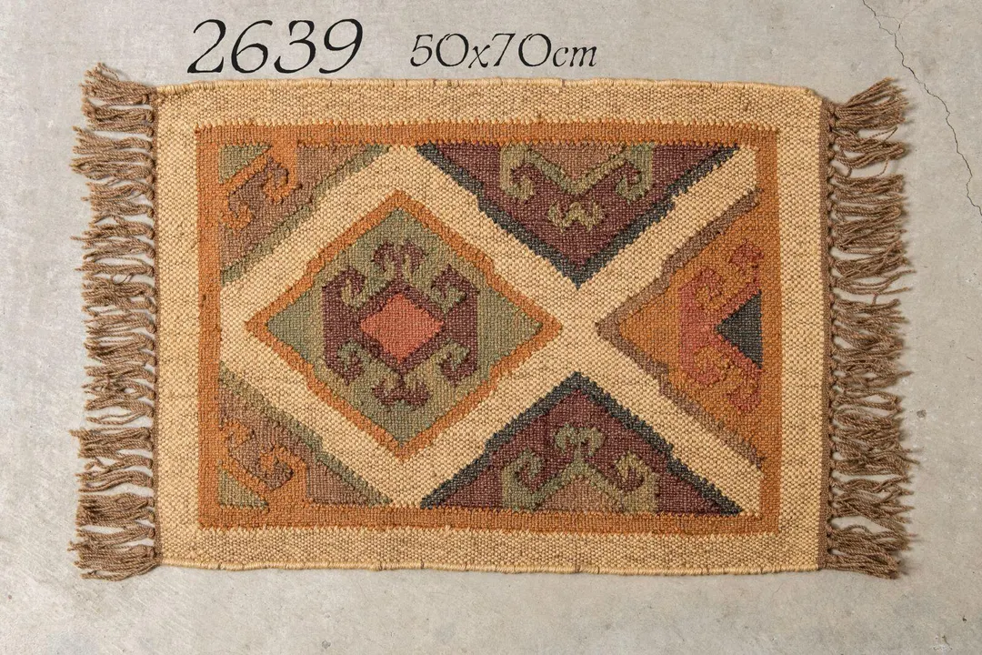 再生ペットボトルの糸を使用したインドキリムフロアーマット。再生糸の柔らかさの幾何学模様やトライバルデザインは室内外でご使用頂けます。