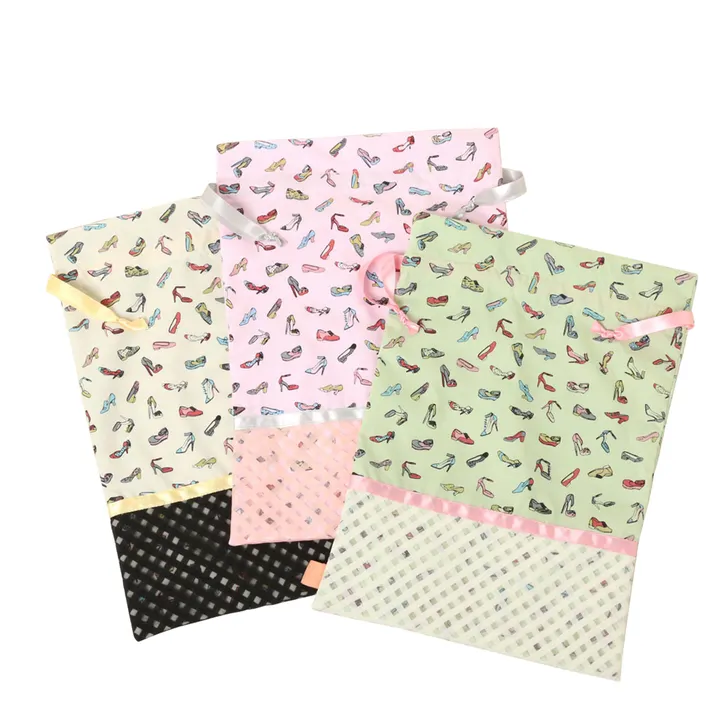 透け感のあるオーガンジー素材との切り替えやサテン調のリボンなど可愛さをギュッと詰め込んだ巾着。 下着や水着はもちろん、ナイトウェアを入れたり、トランクの中でバラバラになりがちなコンセントやアダプタをまとめたりと貴方にあった使い方を見つけて。 靴が散りばめられた総柄デザインは、それぞれ柄やシェイプが違うからお気に入りを探すのも楽しい。