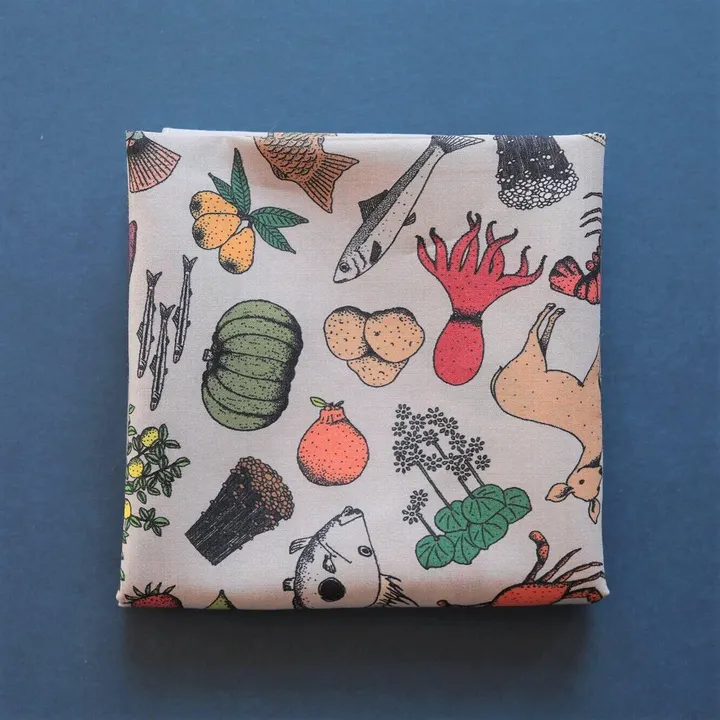 イワシビルや阿久根にちなんだ日本製のハンカチ。 鹿児島県阿久根市の特産品たちのデザイン。色んなものがありすぎます。 阿久根は食が豊かだからか、有名なシェフも多く輩出している町です。