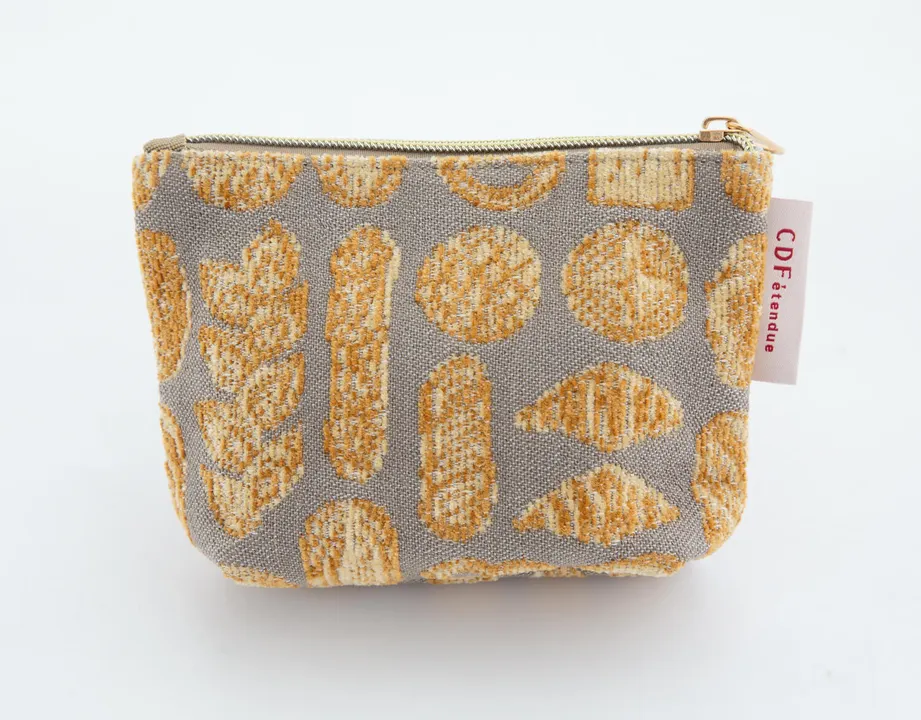 パン好きにはたまらない!!! 思わず手に取ってにっこり笑顔になってしまうような、パン三昧のジャガード織パン柄のポーチ。 パンの部分が起毛になっていて表情があり、肉厚感のあるしっかりとした生地感です。 パンが立体的に見えるように何度も何度も修正した甲斐あって、美味しそうなパン柄の織生地ができました! 大きすぎず、小さすぎず、使えるサイズ感のポーチ。 コスメだけでなく、バッグの中でこまごまバラバラになるものを収納するのに便利です。 内ポケットは付いておりません。