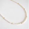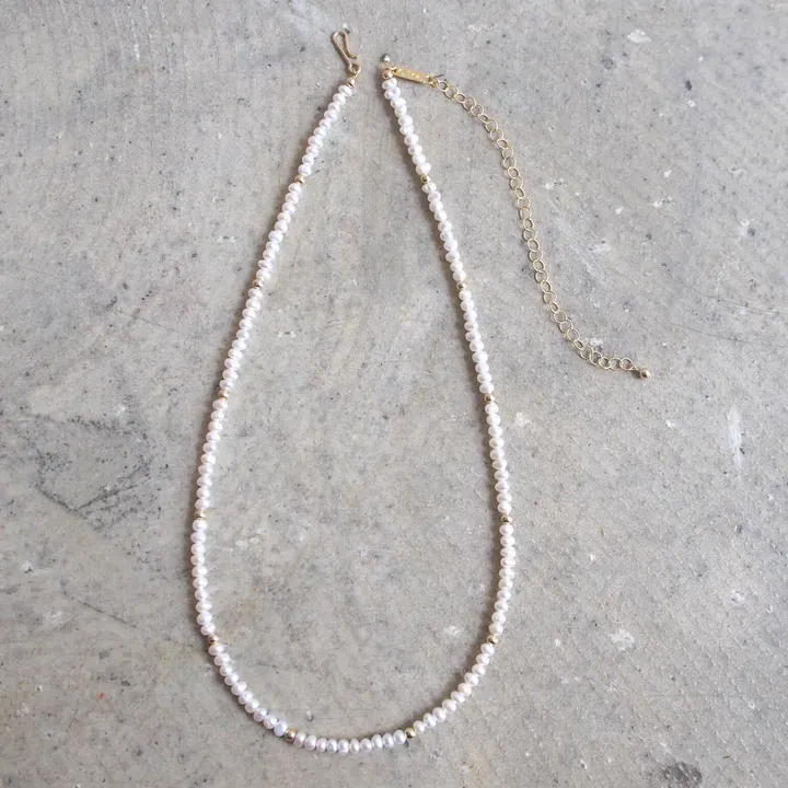 ネックレス【Circle】/14KGF*小粒淡水パール+メタルパーツネックレス \人気アイテムが再入荷いたしました!/ 『暮らしに巡りゆくシンプルアクセサリー』 日々巡り、季節ごと巡り、未来の暮らしにも巡る。 永遠に続く輪のように 身にまとい時に離れても、季節を経てまた戻ってくる。 『暮らしに巡りゆくシンプルアクセサリー』をテーマとした新ラインが誕生しました。 お手入れしながら楽しめるSV925や金素材を中心に、 エンドレスに日常に寄り添うアクセサリーをご紹介します。 Oucaのイヤーアイテムとも好相性◎ トータルで楽しめる『サークル』にパールアイテムが加わります。 Circle=輪 のように 日々や季節が巡るように、自然に身に着けたり外したりしながらも 長い時間が巡ってもいつかまた身に着けたくなるような お手入れをしながら経年を楽しみ 長く側に置いておきたくなるような エンドレスに日常に寄り添うアイテムを揃えていきたいと思います。 第二弾の作品は、自然な風合いが魅力の淡水パールが主役。 淡水パールが放つ本来の魅力を損なわないよう、 さりげないデザインをわずかにプラスした2種類のパールネックレス。 「ゴールドフィルド×淡水パール」という上質な素材そのものの美しさを、 自分らしく末永く楽しんでほしいという思いを込めました。 ベースとなる部分には、「ポテト」と呼ばれるほどよく小粒の淡水パール(3.5~4mm)を。 大粒過ぎない淡水パールは 日常の中にも気負わずとりいれていただけるカジュアルさが魅力。 いつ手にしても美しく魅力的な小粒の淡水パールは、 連ねたときのそれぞれのパールのバランスの違いや表情の違いが全体の味となります。 チェーンや金具部分には、 淡水パールのナチュラルなホワイトカラーに相性抜群な、艶やかなGDカラーが美しい14KGF素材を採用。 チェーンのコマのひとつひとつに細かな刻みが施されたデザインチェーンとフック金具で アジャスター機能をプラスしました。 季節ごとに変化する洋服のボリュームやコーディネートにも対応できるよう、 10㎝と長めに設けたチェーン使いもポイントです。 留め具部分は、シンプルなフック金具。 引き輪金具に比べて胸元に金具を見せても違和感がなく、お好みで付け方を変化させてもお楽しみいただだけます。 ◆詳細◆ 艶めき光るゴールドパーツを淡水パールの間に等間隔にあしらい、 ライン上に「ドット」の雰囲気を取り入れたネックレス。 キラッと輝くGDカラーが、ナチュラルな淡水パールにカジュアルさやモードな表情を加えます。 約10cmと長めに設定したチェーンには、シンプルなフックタイプの金具を採用。 アジャスターとして長さの調節をしていただいたり、チェーン部分をフロントにしてY字ネックレスのような着け方も 金具の収まりが良くおすすめです。