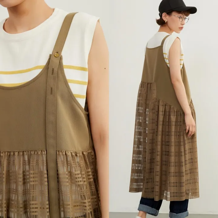KNXO411-チェックレース・異素材ドッキング・レイヤード・シアーキャミワンピ OLIVE/FREE