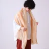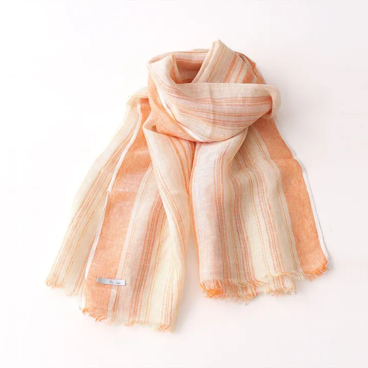 デリケートな首元にもチクチクすることがない上質リネンを使ったオリジナルのリネンストールです。上質で軽やかなリネンは、使い込むほどに柔らかく肌に馴染んでいきます。 ☑ コンセプト 「健康」「環境」「造り」をコンセプトにしたインテリアショップ自社開発のリネン製品 ☑ 天然素材100% 天然素材100%の高品質なアイテムを使いやすい価格で「リネン製品をもっと気軽に」 ☑ 低ホルムアルデヒド 定期的に国内でホルムアルデヒド検査を実施、お子さまからお年寄りまでからだにも環境にも安心 【オールシーズン使える上質リネン】 リネンって夏だけ?と思っている方はサラッとした肌触りながら、やさしい暖かさに驚かれると思います。 あたたかい素材のストールは気分じゃない・・・ 映画館や観劇で肌寒くなってしまう・・・ そんなときも、リネンストールなら重くなりすぎず、季節の変わり目にも重宝します。 もちろん、夏の室内での冷房対策や首元の日焼け防止にも。持ち歩くときは、バッグに結んでしまってもアクセントに。無造作にバッグにつっこんでもなぜかサマになります。 【デザイン】 森の木々、咲きほこる花、川や海の水に光が差し込んで揺らいで見えるあの色の感じを表現したデザイン。同系色の糸に濃淡をつけ何色も織り重ねてグラデーションにすることで、ほっと癒されるような1枚になりました。 ■オレンジ オレンジ、ライトオレンジ、オレンジイエロー、ライトイエロー、カーキ、ベージュを縦糸に組み合わせ、横糸にライトベージュを差し込み、より揺らいだ雰囲気のデザインに。 ■パープル パープル、ライトパープル、ラベンダーパープル、ベージュ、クリームを縦糸に組み合わせ、横糸にライトベージュを差し込み、淡いラベンダーのような雰囲気のデザインに。 ■ブルー ミドルブルー、ネイビー、ライトブルー、2種類のホワイトを縦糸に組み合わせ、横糸にホワイトを差し込み、霞のある地平線のような雰囲気のデザインに ■グリーン 黄緑、若草、モスグリーン、ベージュ、クリームを縦糸に組み合わせ、横糸にオフホワイトを差し込み、芽吹いた新緑のような爽やかな雰囲気のデザインに。