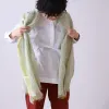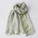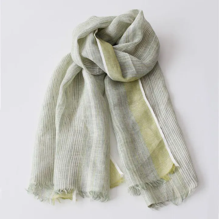デリケートな首元にもチクチクすることがない上質リネンを使ったオリジナルのリネンストールです。上質で軽やかなリネンは、使い込むほどに柔らかく肌に馴染んでいきます。 ☑ コンセプト 「健康」「環境」「造り」をコンセプトにしたインテリアショップ自社開発のリネン製品 ☑ 天然素材100% 天然素材100%の高品質なアイテムを使いやすい価格で「リネン製品をもっと気軽に」 ☑ 低ホルムアルデヒド 定期的に国内でホルムアルデヒド検査を実施、お子さまからお年寄りまでからだにも環境にも安心 【オールシーズン使える上質リネン】 リネンって夏だけ?と思っている方はサラッとした肌触りながら、やさしい暖かさに驚かれると思います。 あたたかい素材のストールは気分じゃない・・・ 映画館や観劇で肌寒くなってしまう・・・ そんなときも、リネンストールなら重くなりすぎず、季節の変わり目にも重宝します。 もちろん、夏の室内での冷房対策や首元の日焼け防止にも。持ち歩くときは、バッグに結んでしまってもアクセントに。無造作にバッグにつっこんでもなぜかサマになります。 【デザイン】 森の木々、咲きほこる花、川や海の水に光が差し込んで揺らいで見えるあの色の感じを表現したデザイン。同系色の糸に濃淡をつけ何色も織り重ねてグラデーションにすることで、ほっと癒されるような1枚になりました。 ■オレンジ オレンジ、ライトオレンジ、オレンジイエロー、ライトイエロー、カーキ、ベージュを縦糸に組み合わせ、横糸にライトベージュを差し込み、より揺らいだ雰囲気のデザインに。 ■パープル パープル、ライトパープル、ラベンダーパープル、ベージュ、クリームを縦糸に組み合わせ、横糸にライトベージュを差し込み、淡いラベンダーのような雰囲気のデザインに。 ■ブルー ミドルブルー、ネイビー、ライトブルー、2種類のホワイトを縦糸に組み合わせ、横糸にホワイトを差し込み、霞のある地平線のような雰囲気のデザインに ■グリーン 黄緑、若草、モスグリーン、ベージュ、クリームを縦糸に組み合わせ、横糸にオフホワイトを差し込み、芽吹いた新緑のような爽やかな雰囲気のデザインに。