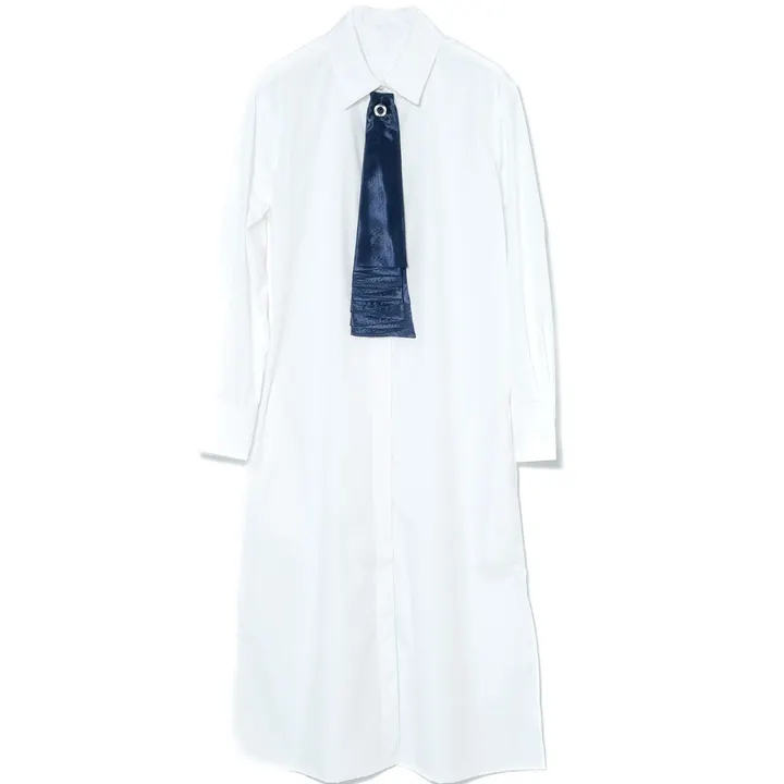 機能性とラグジュアリー感を兼ね備えたブロードで仕立てた、ややゆとりのあるサイズ感のシャツワンピースです。 プリーツ加工でたたまれたオーガンジーのタイがセットされ、ミニマルなシャツワンピースにインパクトを残します。 タイを外してそのままシンプルなシャツワンピースとしても使える汎用性も高いアイテムです。 【ギミック】 カフリンクスでシャツ本体に止め付けられたプリーツ加工のタイを取り外し、プリーツを開きます。開いたプリーツの片側端のボタンホールを衿下の隠しボタンに留めます。 プリーツをぐるっと首に1周添わせ逆側の隠しボタンに留めます。 プリーツタイはプリーツケープに変身します。 ケープの丈は左右で違いますが、左右どちらでもセット出来るのでお好みの向きでお楽しみ下さい。 ---MADE IN JAPAN--- 品番:CH2405-003 商品の着用詳細を動画でご紹介しています。 以下のリンクよりご覧いただけます↓ https://www.youtube.com/shorts/pWaaX9q4I0g