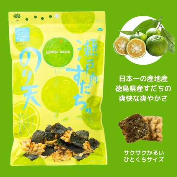 国産海苔の風味とすきっとした徳島すだちの酸味があとひく美味しさです。 うまみのある植物油でサクサク軽い食感に揚げました。