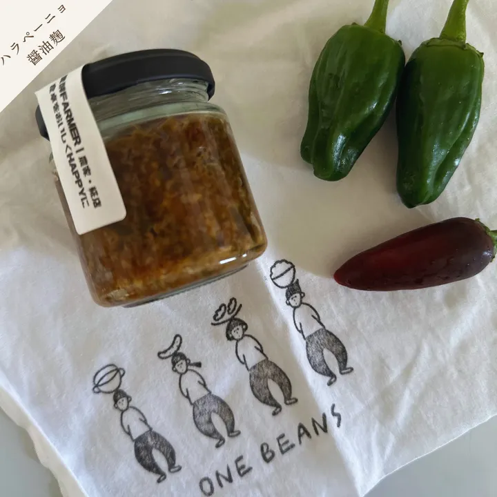 数量限定・ハラショー油麹(ハラペーニョ醤油麹) 自家栽培のお米を麹にし、自然発酵で丁寧につくり上げた特製醤油麹に、無農薬・無化学肥料で育てた自家製ハラペーニョとピーマンを加えて仕込んだ、数量限定の辛旨調味料です。 東北地方の郷土料理「三升漬け」をベースに、自家製ハラペーニョでアレンジ。 ハラペーニョの“ヒリッ”とした辛さに、ピーマンを加えることで辛さを控えめにしつつ、 野菜の旨みがしっかり感じられるやさしい辛さに仕上げています。 おすすめの使い方 ・豆腐やお肉・お鍋の薬味に ・ご飯のお供に ・焼き魚・炒め物・漬け込み料理のアクセントに 手仕込みならではのまろやかな旨みと、旬のハラペーニョが生む爽やかな辛み。 ピーマンの旨味がプラスされた“大人の辛さ”の醤油麹を、ぜひお楽しみください。 原材料:米麹(米:兵庫県丹波篠山市:ONE BEANS)、有機醤油、ハラペーニョ(ONE BEANS)、ピーマン