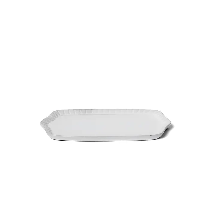 遊び心のあるミュレットの中で、異色の存在感となるマカロントレー。 その名の通りマカロンが最もよく似合う一枚は、薄く軽く繊細に設計しました。 勿論、マカロンに限らず、アクセサリートレーとしてもご使用いただける自由に使いやすいアイテムです。 Mulet(ミュレット) スウェーデン語で「くもり空」という意味を持つ「Mulet」は、その名前の通り、白と灰色のニュアンスのある色合いが印象的なシリーズです。 色合いだけ見ると、ともすれば冷たい印象を受けそうですが、Muletにはあたたかな雰囲気が宿っています。それは、あえて1点1点少しずつ異なる形に仕上げた歪みのある形、釉薬の濃淡などから、手仕事の跡やぬくもりが伝わってくるから。決して派手さはありませんが、お料理をそっと静かに引き立て、例えば異素材である木や金属、ガラスなどの器やカトラリーなどにもしっくりと馴染みます。 Muletシリーズは土からオリジナルで開発するこだわりをもって作られています(一般的には製土屋さんから土を購入し、そのまま使用されるつくり手さんが多いのです)。コバルトや鉄分を多く含んだ土に、日本で古くから使われてきた信楽焼のさっくりとした荒い土をブレンドした黒土に磁器の成分を20パーセントほど足し生地の強度を上げ、オリジナルの乳白の釉薬を掛け、何度も試作を重ねてようやくこの独特の色合いが完成しました。 そして、このシリーズを作るために岐阜県に構えた自社工房にて、攪拌機で練り上げ、1250度で焼き上げます。高い温度で焼き締めているので、薄くて丈夫な仕上がり。電子レンジや食器洗い機を使うこともでき、とても実用的です。 Muletには「レリーフ」「ライン」「ハンド」の3種類のラインナップがあります。 植物模様が華やかなレリーフ、どんなお料理にも合うシンプルな縁のライン、そしてデザイナー自身がロクロで手引きした原型に忠実な形状と、シーンやお好みで楽しんでお選びいただけます。