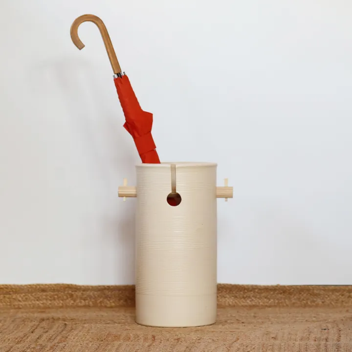 モノトーンのスマートさに、ウッドハンドルのナチュラルな温かみをプラスした傘立て。 どんな玄関にもすっと馴染み、やわらかな暮らしの空気感を演出してくれます。細身のシルエットなので、ワンルームの小さな玄関からファミリー玄関まで、幅広いスペースに置きやすいのも嬉しいポイント。 カラフルな傘はもちろん、落ち着いた色味の傘とも相性抜群。傘のデザインを選ばず、すっきり美しくまとまります。