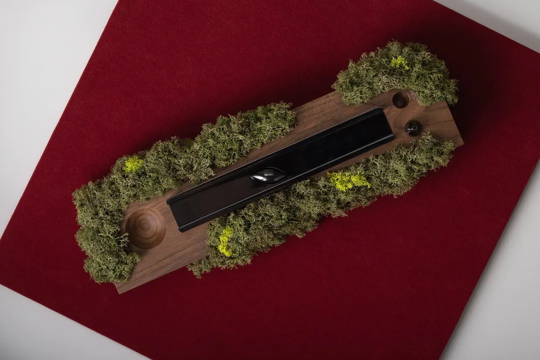苔アーティスト「坂本奈緒美(さかもと なおみ)」との初コラボアイテム。プレミアムシリーズ「スピンドル(ブラック)」に苔アートをくわえた逸品。 男性的なイメージの強いグラビモルフに対し、妖精がでてきそうな柔らかく・優しい森(女性的な)をイメージした坂本氏。多種な緑の苔を使い、フワフワした自然な風合いが切削加工で生まれた直線と球面にマッチし、ユニークで神秘的な作品になりました。切削加工された部分を全て隠すのではなく、あえて一部残し、日本人が古くから愛している不完全さ(不規則性)を表現しています。 全て手作業で制作しているので、1つ1つあなただけのオリジナルアイテムになります。 動きと音色はスピンドル(ブラック)と同様ですが、ベースとなる木部に精密な切削加工を加えているので、音の響きが玉のぶつかる場所で異なります。また、通常品に比べ、音色がさらに優しい音色になっています。 【天然苔・スカンディアモスとは】 北欧スカンジナビアの自然から生まれた100%天然素材のディスプレイ用「苔(moss)」です。化学薬品を一切使用せず、天然ミネラルで保存処理し、特殊な技法で着色しているため環境にやさしい素材です。メンテナンスフリーでありながら、空気清浄化・調湿効果・脱臭効果などの機能もあり、次世代のグリーンインテリア素材として注目されています。ただ、北欧の特定の地域かつ専門家が管理した森からしか採取されないため大変希少な素材です。 ※通常は毛先の長いスカンディアモスを使用しますが、毛先の短いポリエステル製の人口苔を使用したコラボも作成可能です。不特定多数の人が利用する場合や、乾燥や風の影響が強いイベント会場などで使用する場合はポリエステル製の人口苔をおすすめします。 【受注生産】 受注生産のため、購入後1~2か月後に配送します。 【ギフトラッピング】 ギフトラッピング(+300円)ご希望の方には、専用ラッピングペーパーで包装し、専用ショップバッグをお付けしてお届けいたします。 【仕様】 金属:ステンレス304 木材:ウォールナット 苔:スカンディアモス / 又はポリエステル製の人工苔 サイズ:W410×D130×H80mm 重さ:1800g 【注意事項】 ・本製品は水平な場所に置いてご使用ください。少しの傾きでも動きと音に影響ができます。 ・本製品は金属部品と木工部品が分解できます。部品によっては表裏で表面処理内容が異なる部品もあるので組立にご注意ください。 ・金属部分の黒染加工は加工の性質上全てが同じ仕上がりにはなりません。また時間とともに経年変化してきます。 ・天然の木材を使用しているため、木目や色味がそれぞれ異なります。 本製品は精巧な製品です。落としたり, 強い衝撃を与えると破損の原因となります。 ・火のそばやストーブのそば、直射日光の強いところや炎天下の車内などの高温の場所で使用、放置しないでください。 ・水に濡れた場合は速やかに柔らかい布で水分を拭き取ってください。 ・乳幼児の手の届かないところに保管してください。 ・スカンディアモスは1つ1つ手作業で作業しているため、アイテムごとに誤差があります。スカンディアモスはメンテンナスフリーです。また、極端に乾燥する場所や外気に触れ続けるとスカンディアモスがダメージうけるのでお避けください。 ・人工苔は1つ1つ手作業で作業しているため、アイテムごとに誤差があります。天然苔のスカンディアモスより乾燥や外気に強いです。