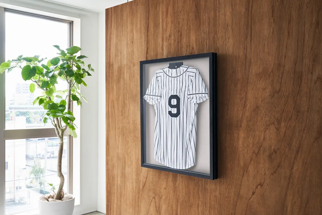 開閉式のため、ユニフォームの掛け替えが前面からできるユニフォーム額。 野球・サッカー・バスケ・アメフト・Tシャツ・レプリカ・オーセンティックなど、様々なサイズに対応。 チームに合わせた、裏地の布色の変更など、カスタマイズも可能です。