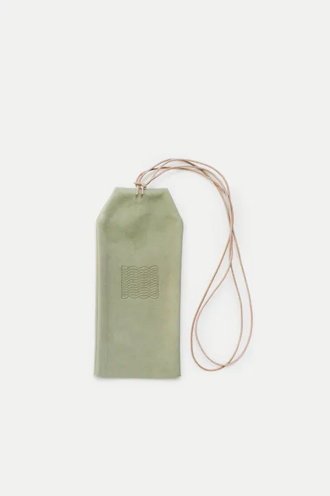 革紐の先端に付いているステンレスフープに眼鏡のテンプル部分を取り付け、付属のカバーを掛けて首や肩から下げて使用するタイプの眼鏡カバー。上質で柔らかいシープスキンを使用しているので、眼鏡を傷つけにくく、外した眼鏡を安全に身に付けることができます。ファッションの一部として、持ち物の少ない方へおすすめです。
