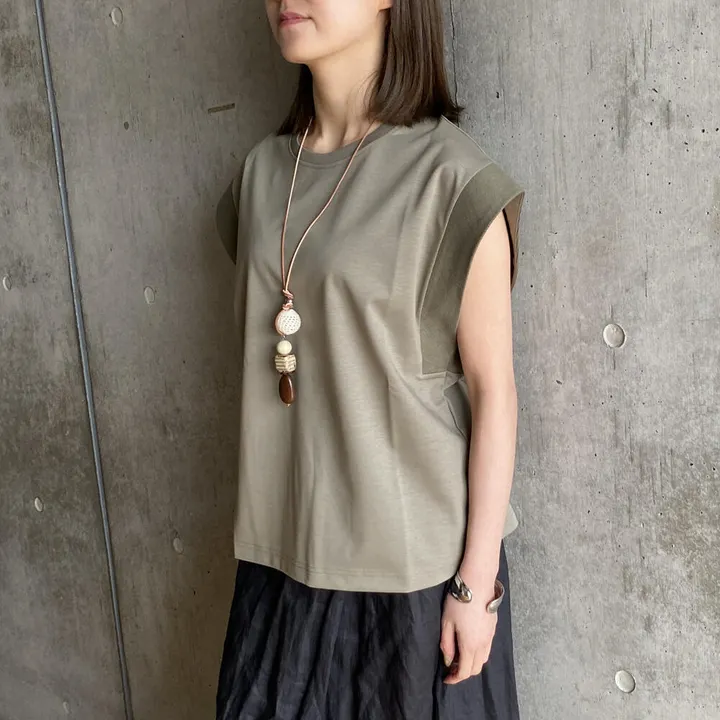 コットンポンチ_スクエアショルダープルオーバー 袖くちが異素材の切替をあしらったプルオーバー 全体がスクエアのシルエットで 襟回りは狭めのクルーネックのTシャツタイプ 袖口は大きくあいています パンツ・スカートはもちろんデニムとの相性も抜群です。 Cotton 100% スーピマコットンポンチロイヤルクール 柔らかくしなやかな風合いをもつスーピマコットン コットン100%ですが上品な光沢のある ストレッチ性の高い素材です 最高級の品質を誇るピマ・コットンを ハイゲージで編み極限まで毛羽をそぎ落し ロイヤルクール加工を施しているので 触感がひんやりとして、透けにくく 柔らかく着心地がいいのが特徴です made in japan