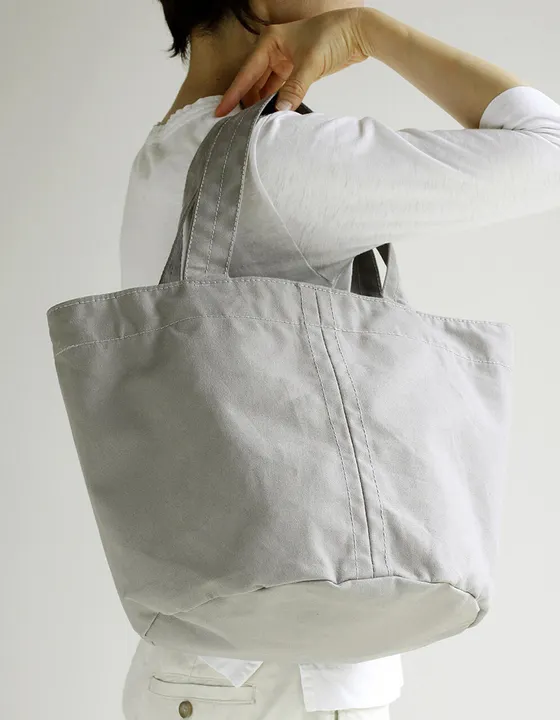 しっかり感が程よいキャンバス生地(14oz相当)で作ったシンプルなトートバッグ。 底が円形のチューブ型で、ちょっとしたお出かけやショッピングにちょうど良いサイズです。 使い込み、洗濯をすることで風合いと愛着が増すバッグは、気軽に使えるリーズナブル感と季節やコーディネートを楽しめるカラー展開が人気です。 内側にファスナー付きポケット1つと、開口部にスナップボタン。