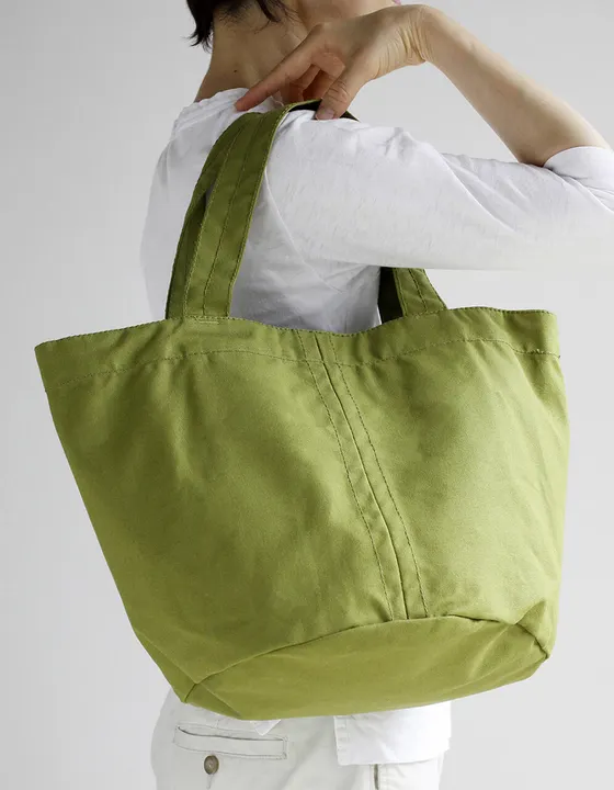 しっかり感が程よいキャンバス生地(14oz相当)で作ったシンプルなトートバッグ。 底が円形のチューブ型で、ちょっとしたお出かけやショッピングにちょうど良いサイズです。 使い込み、洗濯をすることで風合いと愛着が増すバッグは、気軽に使えるリーズナブル感と季節やコーディネートを楽しめるカラー展開が人気です。 内側にファスナー付きポケット1つと、開口部にスナップボタン。