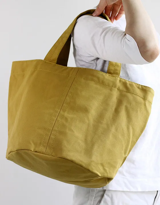 しっかり感が程よいキャンバス生地(14oz相当)で作ったシンプルなトートバッグ。 底が円形のチューブ型で、ちょっとしたお出かけやショッピングにちょうど良いサイズです。 使い込み、洗濯をすることで風合いと愛着が増すバッグは、気軽に使えるリーズナブル感と季節やコーディネートを楽しめるカラー展開が人気です。 内側にファスナー付きポケット1つと、開口部にスナップボタン。
