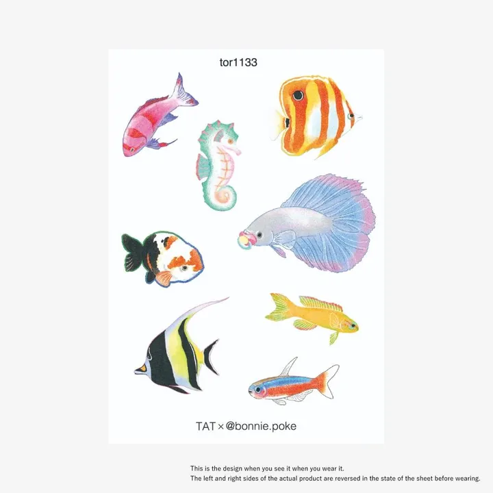 <タトゥーシールについて> ・水で転写するタイプのタトゥーシールです ・約3日間肌に綺麗な状態で保ちます ・裏面に貼り方の説明の記載があります 熱帯魚達のデザイン。海外の彫り師さんとのコラボデザイン。 <貼り方について> 1. 貼りたいデザインを切り抜きます 2. フィルムを剥がします 3. 貼る場所を決めます(着用するとデザインは反転することに注意) 4. 台紙に水分を染み込ませます 5. 30秒ほど台紙を押さえます 6. ゆっくりを台紙をスライドさせて完成 <ブランドについて> irodoreは「肌に一番近いおまじない」をコンセプトにしたタトゥーシールブランドです。日常的に使えるナチュラルで可愛い、綺麗なデザインを多数展開しています。