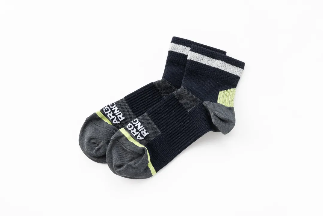 自転車専用ソックス「RING-KO(輪行)ソックス」。RING-KOソックスは、これまでの自転車ソックスにはなかった快適性と機能性を追求して開発されたモデルで、サイクリングはもちろん、輪行旅にも最適な設計となっています。 RING-KOソックスが優れている点は、まず吸汗・速乾性の高さにあります。汗をすばやく吸収し素早く乾かすため、長時間のライドでも快適さが持続します。また、フィット感にもこだわり、ペダリング時のパワーロスを抑える構造を採用。デザインは街中でのカジュアルライドにも合わせやすいショート丈とシンプルな仕上がりで、場面を問わず使いやすい一足です。 さらに、RING-KOソックスは文字通り「輪行」に最適な機能を備えています。手洗いしても一晩で乾くため、数日間の旅行でも一足で対応可能で、荷物の軽量化にも貢献します。消臭効果にも優れており、移動中や食事の際に足の臭いを気にする必要がありません。また、自転車を畳んで持ち運ぶときに合わせやすいショート丈を採用しているため、膝下ショーツなどとも好相性です。 素材にはメリノウールを使用しています。特に本製品では特許取得のハイブリッド素材「NIKKE AXIO(ニッケ アクシオ)」を採用。細くしなやかなメリノウールに、強度の高いフィラメント糸を組み合わせることで、耐久性・快適性・機能性を高いレベルで兼ね備えています。摩耗に強く毛玉ができにくいほか、汗をよく吸い乾きやすい特性を持ち、消臭効果や保温・調湿機能にも優れています。冬は暖かく、夏は放湿作用により涼しい履き心地を感じられる、年間通して頼れる素材です。 RING-KOソックスは軽量で、薄手ながら必要なサポート性をしっかり備えています。日本国内で製造されており、品質面においても安心してお使いいただけます。