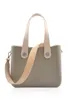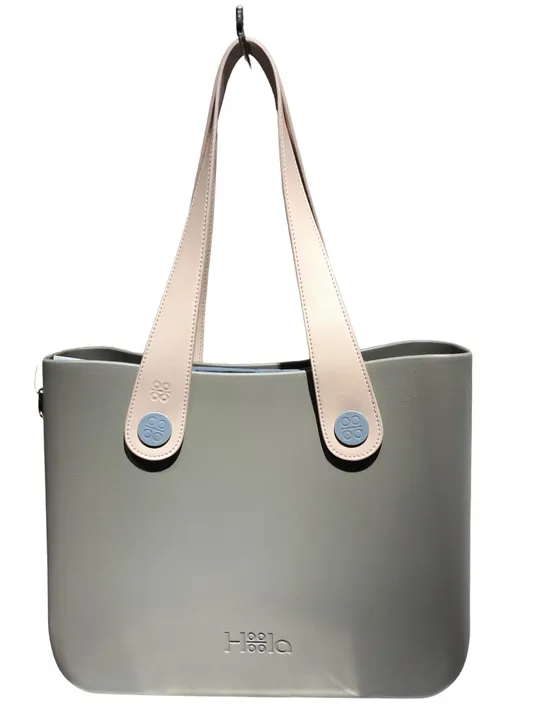 ◆シティ感と柔和な雰囲気をMIXさせたニュアンスグレーのトートバッグ。通勤からアフター5のコーディネートまで幅広く取り入れやすく、書類や手帳もすっぽり収納。ハンドルは革製品がお好きな方にもおすすめなカーフレザーです。  ■構成部品 Frame:Sage Grayl Flat Handles : Nude Plastic Twists: Gray