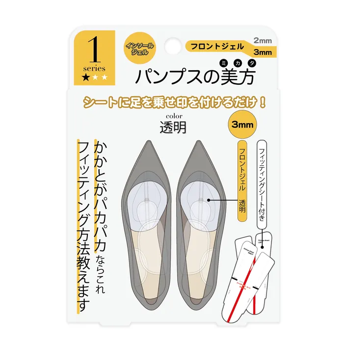 このインソールは次の方にオススメします。 ・歩くとかかとがパカパカする ・靴が少し大きいような気がする ・靴の甲に変なシワができている 上記が気になる方は、足と靴の間に隙間があり足に靴が合っていません。 隙間を埋めるには下記サイズの厚みのフロントジェルを選んでください。 履き口に指先を入れ、指先1本がラクに入る場合は、フロントジェル 2mmを目安にしてください。 履き口に指先を入れ、指先2本がラクに入る場合は、フロントジェル 3mmを目安にしてください。 パンプスの美方・シリーズ❷のリアジェルを使用すると前すべりがしづらくなりますので併用をオススメすします。 更に足と靴の隙間を埋めても、横アーチが崩れていると効果が発揮できませんので、パンプスの美方・シリーズ❸のナミダジェルもオススメします。