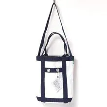 ~ RUSTICターポリンシリーズ~ 横断幕用のターポリンの端材・残材で作ったトートバッグ。堅牢なターポリンは耐久性・耐水性・防汚性に優れ、普段使いからヘビーデューティーまで広くシーンをカバーします。数百種ある生地の中からバッグに最適な、軽くて腰のある素材を選びました。自立する、ほど良い張りが使い勝手を高めます。横断幕の裏面を表に使用しているので、表面は白、裏面には印刷が入っている場合がありRUSTICの人気のヒミツです。 ■バイク乗車時にたすき掛けができるメッセンジャー仕様 ■外ポケット1、内ポケット1 ■H40cm W28cm D12cm ハンドル100cm/55cm ワインボトルが3本入るサイズです ■日本製
