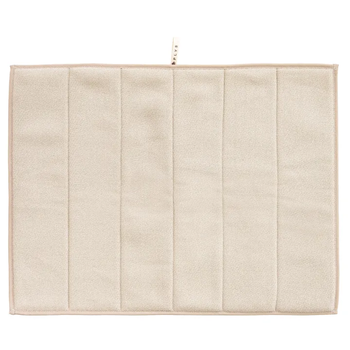 毎日の洗い物をもっと快適に、もっと気持ちよく。ちょっとした洗い物を干したい時に役立つ水切り吸水マット。人気の吸水マットを快適性と機能性にこだわり、より使いやすい仕様にリニューアル!表面に「梅炭和紙」を使用した生地を使用し、サラサラでにおわない。梅炭和紙は、優れた消臭効果をもち、気になるニオイも抑え、キッチンを常に清潔に保ちます。本来産業廃棄物になってしまう梅の種を、炭化させパウダー状にしたものを練り込んで作った、リサイクル素材です。裏面には吸水性と通気性に優れたハニカム構造のメッシュ生地を使用しているので乾きやすくなっています。中にはウレタンが挟まれており、大切な食器への衝撃をやわらげてくれます。また、ご使用になっていない間はひっかけ紐でつるしておくことができるので場所を取らず省スペースです。同シリーズ「プリスベイス 水切りラック」と併用してお使いいただくと、より洗い物が快適です。水切りラック、吸水マットは別売りです。