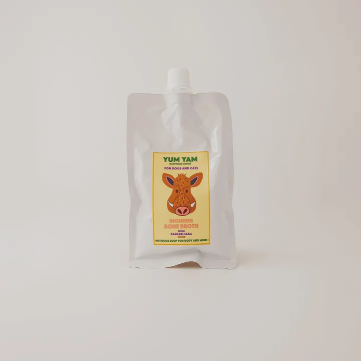 イノシシの骨をゆっくり時間をかけてコトコト煮込み、骨に潜んでいる髄やコラーゲンをしっかり抽出。骨には沢山の栄養素が豊富に含まれておりBONE BROTHは飲む血液と言われ、また腸内のバランスを整え働きを良くするとも言われています。  ・水分補給のお供に…お水が苦手な場合はお水に少し混ぜて美味しく水分補給をスムーズに  ・手作りご飯のお供に…ご飯を作る際にお出汁として使用しより美味しく食べてもらう 食欲のない時やお年を重ねあまりご飯が食べられない、術後の回復食としても活躍してくれる逸品です。 BONE BROTHに含まれる豊富なアミノ酸は筋肉や血液、髪の毛や皮膚などの体の土台を作る元ともなり、カルシウムやリンは骨を強くし、コラーゲンやヒアルロン酸は細胞に潤いを与え、関節の保護にも一役かってくれる優れた栄養素たちです。 ただし、ナトリウムやカリウムは摂取しすぎてしまうと体調不良の原因にもなってしまいますので大量摂取はお控えください。 また、腎疾患がある場合はお医者様にご相談するかご自身の判断にて適量を与えてください。 内容量:180g 成分:(100g/29kcal) 水分94.8% 粗タンパク質4.59% 粗脂肪0.35% 粗繊維0% 祖灰分0.26% 可溶無窒素0%