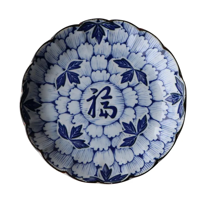 満開に咲き誇る花と葉が調和した趣がある模様ができました。 和洋中どんな料理のスタイルにも合わせやすいデザイン。 お皿の中心には「福」の文字が施されて縁起にも良い、使った人誰しもが幸福をもたらす器になります。 落ち着きある藍色が、食材の色を映えさせて彩り豊かに魅せてくれるのも嬉しいポイントです。