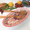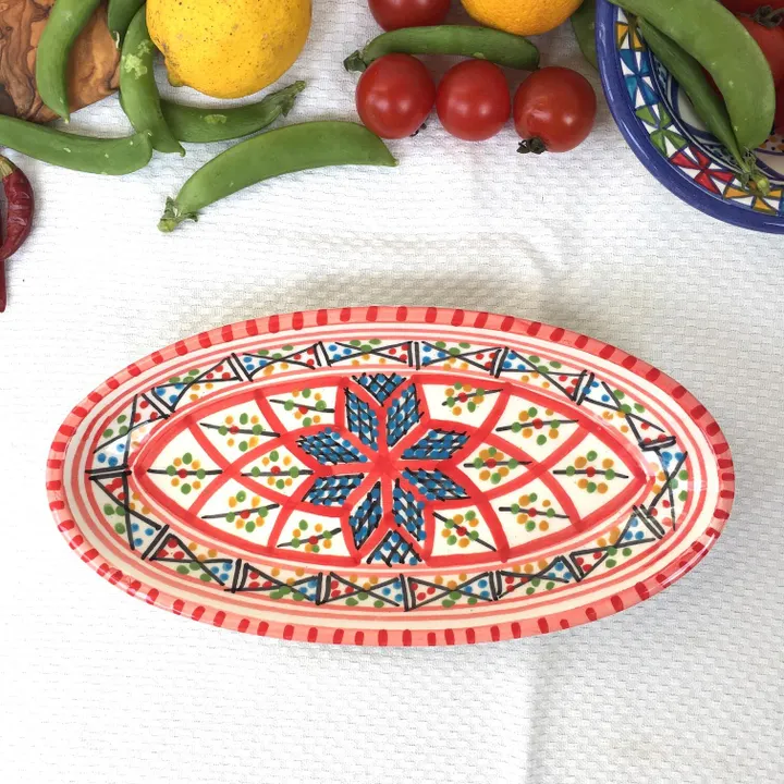 サイズ:約24×11×高さ3cm ※デザインは入荷時により多少異なることがございます。 チュニジアで陶器の町といえば「ナブール」 鮮やかな手つきでロクロを回し、その後で皿に絵付けをしている女性の手つきの見事さに感嘆。 たくさんある中でもよりすぐりの皿ばかりを選んでおります。 *「ナブール」は観光客だけでなく、チュニジア人でも陶器を買いに行くときは「ここ!」、というほど陶器の街として知られています。 この町の工場で職人が1点1点鮮やかな手つきでロクロを回し、皿に絵付けをしている女性の手つきの見事さに感嘆します。 中心から放射線状に広がる模様は、ほとんどの工房がこの柄で絵付けするほどオーソドックスです。 色鮮やかな文様は食べたあとでも食卓を華やかに演出してくれます。 *400年以上歴史のあるチュニジア伝統の絵付け陶器の街ナブールから、地中海の風をお届けします。 *電子レンジ・食洗器のご使用も可能です *ナブールは瀬戸市と姉妹都市です。