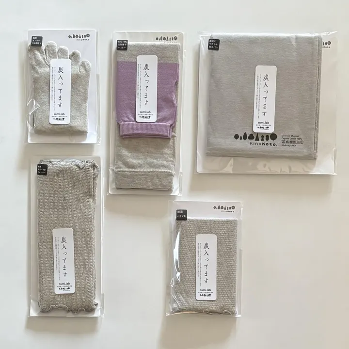 (サンプル)sumi.lab シリーズ人気5点|極薄腹巻き|極薄レッグウォーマー|薄手アームカバー(LV)|インナー5本指靴下|枕カバー|炭染め|オーガニックコットン