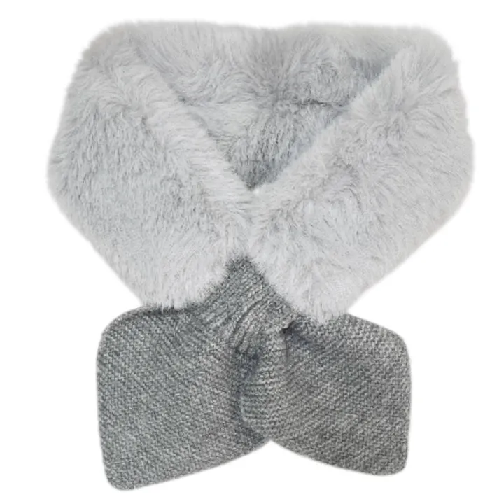 ファー素材とニットを組み合わせた差し込みタイプのショートマフラー。ニット部分は配色の柄編み。フィット感のあるサイズに仕上げています。