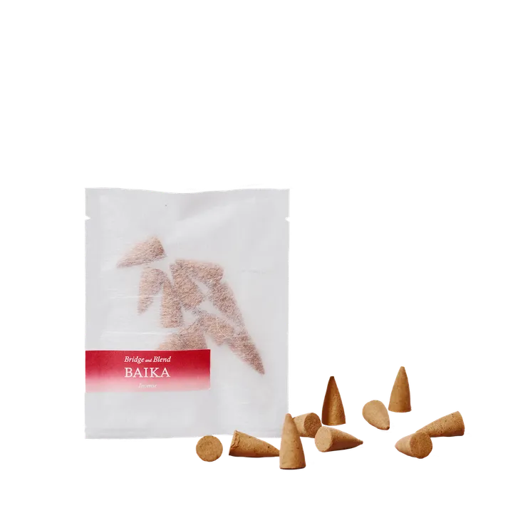 MADE IN JAPAN 🇯🇵 【OMOTENASHI Selection 2023 受賞ブランド】 源氏物語に登場する香り Six in Sense—BAIKA は、1000年前の調合にインスパイアされた梅の花をイメージした春を感じるお香です。 BAIKA は『源氏物語』の32帖「梅枝」に登場します。詳しくはBridge and Blendのブログ《源氏物語と梅花》 世界中から届いた香原料が 1000年前の日本で出会い、交わり、日本の香りとして世界へ旅立つ。淡路島の香司と再現した1000年前の記録に残る調香レシピで「古くて新しい」お香体験が可能。サステナブルを意識した手のひらサイズのパッケージ(フルサイズ)は蓋を香皿として使用可能。備え付けの香立で、最後までしっかりとお香を焚けます。 せわしないデジタル社会を離れ、お香に火を灯し、煙が立つのを目で追い、香りを聞く穏やかな時間へ。アナログな所作とともに、あなたを静かに過去へと誘い、「心」を丁寧に整える贅沢なひとときをお過ごしください。 <主な香原料> 沈香 白檀 貝香 龍脳 丁子 乳香 甘松 <3つのこだわり> ・100%天然香原料使用 ※千年前の調合に限りなく忠実に再現するため、希少価値の高い沈香を20%以上という高配合率で使用 ・クラフトマンシップ — 淡路島でハンドメイド、東京でハンドパック ・サステナブルを意識したパッケージ ※売り上げの1%を自然保護団体「1% for the Planet」に寄付しています。 <利用シーン> ・心を整える時間に ・大切な方へ感謝のギフト ・バスタイムのくつろぎに ・読書に集中したいときに ・ゆったりとした気持ちで ・旅先での自分の空間作りに <数量> コーン型 10個  ※通常の1.5〜2倍の大きさです。 <おすすめ商品> ・フルサイズ  20個入り ・お試しサイズ 2個入り ※香炉灰 一緒にお使いいただくと、お香がより最後まで無駄なく燃え尽きます。ぜひお試しください。