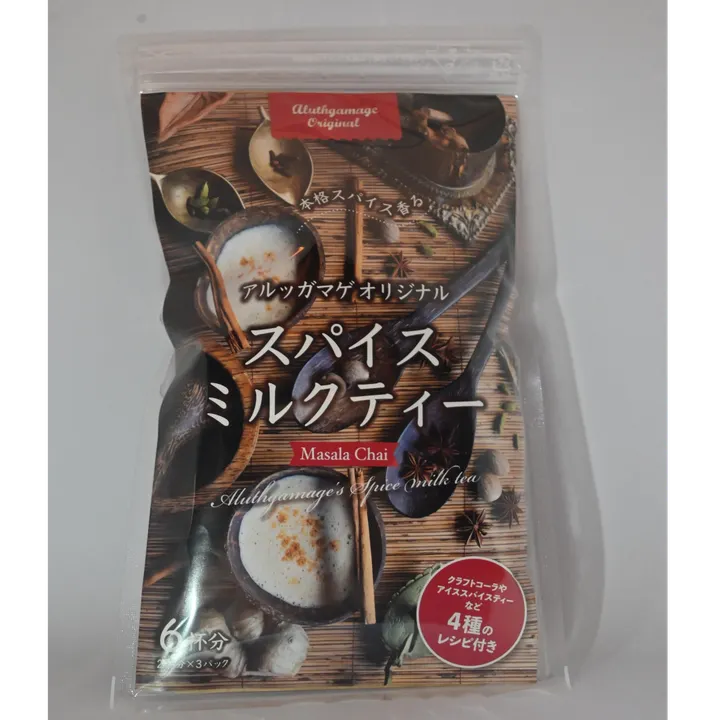 「アルッガマゲのスパイスミルクティーの素」 4つのレシピがついています(スパイスミルクティー(ホット&アイス)、ミルクティー、クラフトコーラ)。 使用しているのは、スリランカ中部ディンブラ地方の高級茶葉です。 しっかりした味わいとコクが特徴の茶葉を、選りすぐりのスパイスたちと組み合わせました。 ◎シナモン ◎ジンジャー ◎カルダモン ◎グローブ ◎スターオニス ◎ナツメグ どれも、胃腸の調子を整えたり身体を芯から温めたりしてくれる万能スパイスたちです。 キットに入っているスパイスパックを鍋で煮出して作ります。 飲んで美味しいのはもちろんのこと、作っている時に湯気とともに立ち上がるスパイスと茶葉の香りが、深呼吸したく なるような癒しを感じさせてくれます。