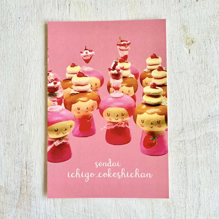 創作こけしのいちごパンケーキ&パフェちゃんの ポストカード。 額に入れて飾っても楽しめます!! 日本・仙台は『こけし』の名産地。 仙台いちごをモチーフに 頭にパンケーキやパフェをのせたかわいい、小さな創作こけし。 いちごソースがアクセント!! 仙台在住のイラストレーター泉友子が絵付け。 いちごパンケーキ&パフェちゃんがポストカードになりました。 縦150mm×横100m 上質紙 オフセット印刷 *PCモニターやスマホ画面と色が違って見えることがありますので、 ご了承お願いいたします。