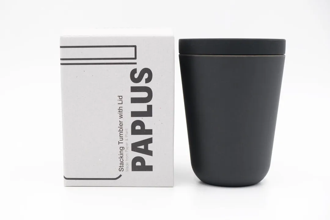 PAPLUS® Stacking Tumbler Black with Lid (パプラススタッキングタンブラーブラック ウィズリッド) Lot.No.CMN2410300700STBL これまで蓋付きのプロダクトは「プラスチックフリータンブラー」のみの展開で、スタッキングタンブラーに対応した蓋はありませんでしたが、シリコーンリッド(蓋)が付属されたシリーズが加わり「スタッキングタンブラーの蓋は?」というご希望に対応しました。 シリコーン製なので、落としても欠けることはなく、取り扱いも簡単です。 PAPLUS®製品の原材料は、トウモロコシのデンプンを発酵して得られる乳酸が主成分のPLA(ポリ乳酸)と紙が主原料です。 地球に優しい素材で作ることで、陶器や木材製品のように天然素材独特の風合いとなっており、愛着を持ってお使いいただけるよう色合い、濃淡などの個性を大切にしています。 ■こだわりのデザイン PAPLUS®スタッキングタンブラーブラックは、独特の素材感を生かすためシンプルなデザインにこだわりました。ミニマムはシルエットとマッチしたマットブラックカラーに仕上げています。底面に向かって厚みを持たせることで生じる安定感ある重量バランスもこだ割ったポイントです。 ■ウレタン塗装について 今回採用した塗装は、黒の顔料をウレタン樹脂に溶いて塗装するウレタン塗装となり、人体に無害とされている人工塗料で食品衛生法にも適合しています。また、天然由来成分の比率が高いPAPLUSは木材製品と同じように水に対して少しデリケートですが、ウレタン塗装をすることにより耐水性が増し、経年変化のスピードを抑える効果があります。 実はPAPLUS®の主原料であるトウモロコシ由来の生分解性樹脂(ポリ乳酸)は塗料をはじいてしまう性質を持っています。その課題を、日本のモノづくりである漆塗りのノウハウを持つ協力工場の下塗り技術により解決することができました。 *回収されたカラーバリエーションは塗装部分をグラインダーなどの工具で剥がすことができ、内側は塗装をしていないので効率よくPAPLUS®の純粋な材料だけを再製品化の工程に回すことができます。 ■パッケージへのこだわり パッケージには新聞や雑誌の古紙からできた100%再生紙である「チップボール」を使用することで天然素材であるPAPLUS®の風合いととてもマッチしています。 ■地球と調和する素材 PAPLUS®スタッキングタンブラーブラックの約86%は植物由来成分であるトウモロコシ由来の樹脂と紙でできています。その主成分に、耐熱性機能を担保するために粘度鉱物(約7%)と石油由来の添加剤(約7%)を加えています。 *1 また、素材の大部分は微生物の働きにより水と二酸化炭素に分解されます。*2 *1 最低限使用している添加剤は、厚生労働省が定める食品衛生法に準拠しておりますのでご安心ください。 エコ商材といわれるものの中には添加剤について言及されていないものが多くあります。 ご注意ください。 *2 分解に要する時間や程度は環境により大きく変わりますので100%を保証するものではありません。 ■暖かい飲み物もOK 植物由来成分純度の高い製品の多くは耐熱機能を持たないものが多い中、PAPLUS®スタッキングタンブラーブラックの耐熱温度は120℃ですので安心して暖かい飲み物にお使いいただけます。 ■使い捨てるのではなくリサイクル PAPLUS®製品はゴミとして捨ててしまうと焼却されてしまいます。ほとんど植物由来成分からできているのでカーボンニュートラル(実質的にCO2を増加させない)ですが、ゴミとして焼却するのではなく、資源として回収し、再製品化することにご協力ください。共に新たな循環を作り出していきませんか。 PAPLUS®のリサイクルページはこちら  https://paplus.jp/recycle/ ■生産から回収・再製品化の過程を公開 PAPLUS®スタッキングタンブラーブラックには「トレーサビリティカード」が同梱されています。そのカードにはロットナンバーとQRコードが記されており、そこからその製品の製造時期、タイプ、回収・再製品化された数量などサイト上で確認いただけます。 PAPLUS®のトレーサビリティページはこちら https://paplus.jp/traceability/cmn2410300700stbl/